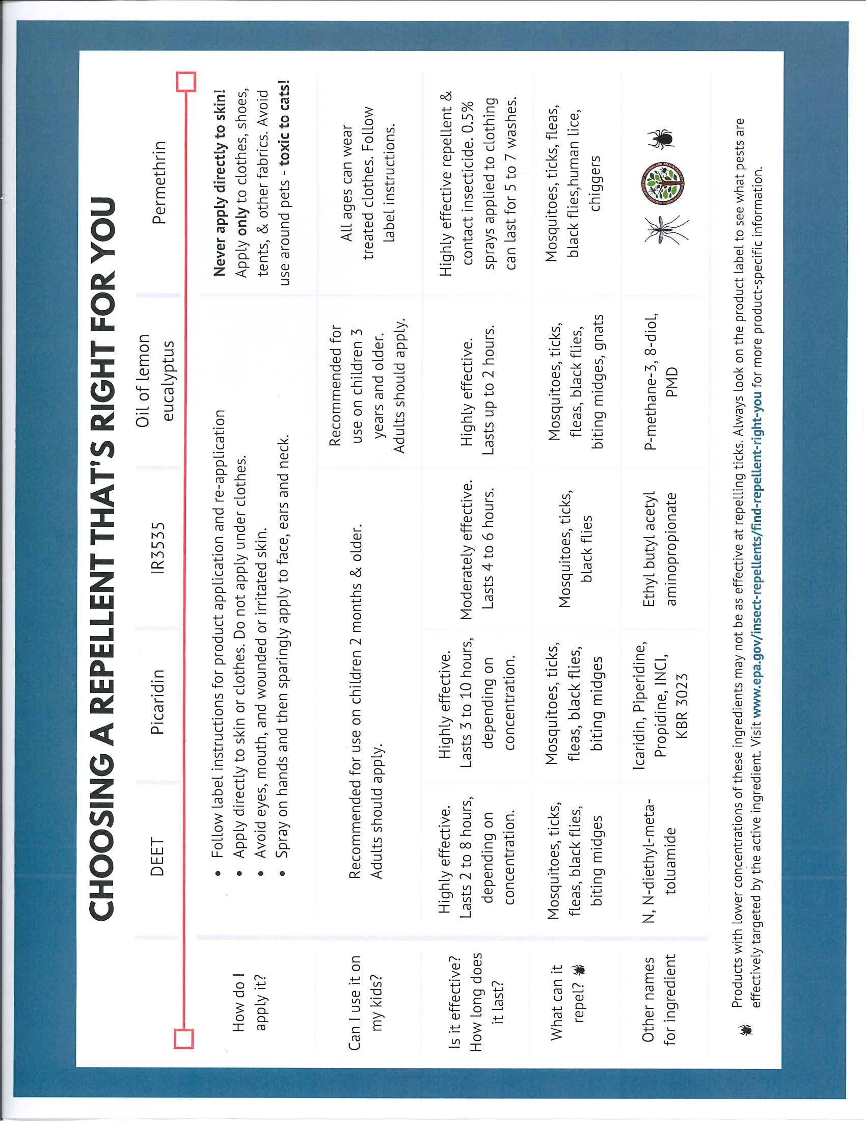 For information about choosing a mosquito repellent:  Mosquito Repellent