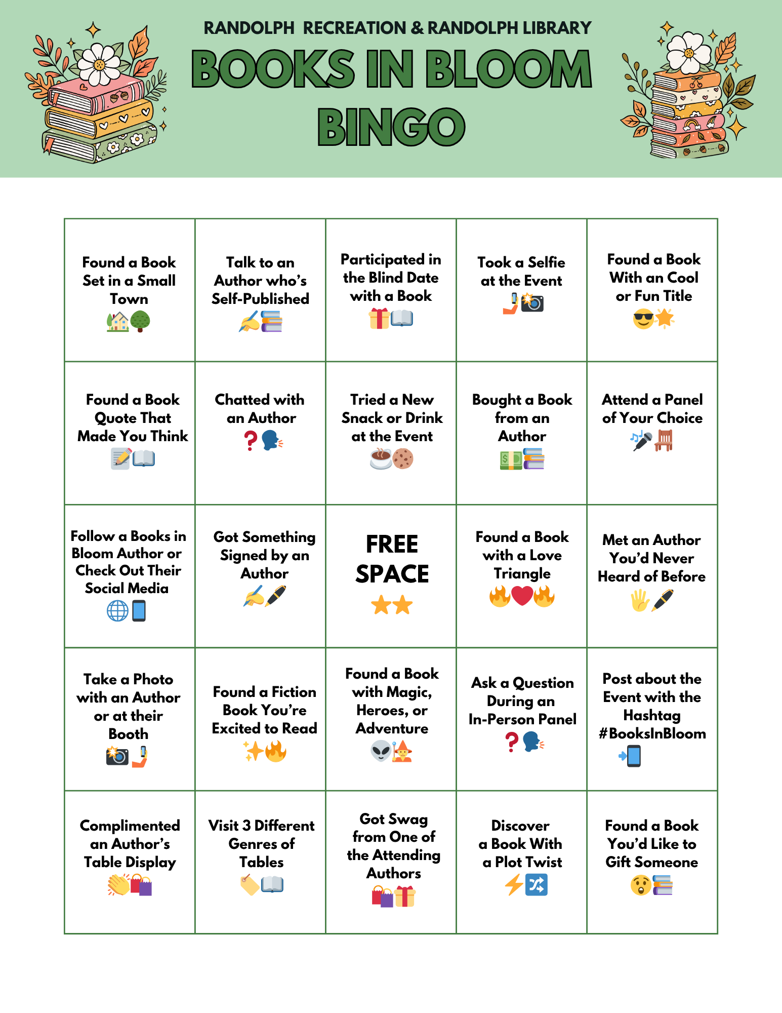 - Celebrate spring with our indie author book fair! Meet local authors, author talks, and fun activities. Also, enjoy cookies, cocoa, Book Bingo and a raffle.